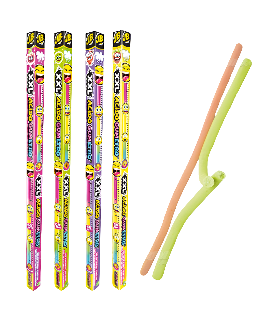 Acido Gumetro XXL - Très Long bâton de chewing gum de 41 cm rempli d'une poudre super méga acide la version XXL (70gr) !! - Parfum : fraise, pomme, cola et cerise -